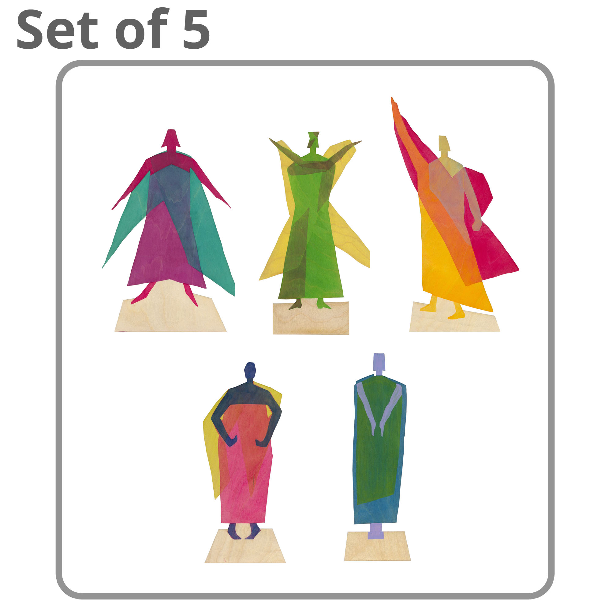 The figures are painted on high quality 3mm Russian Baltic Birch plywood that has been precision lasercut to the exact outline of Rudolf Steiner’s preparatory sketches. The wood was then sanded smooth, treated, and then hand painted with archival quality pigmented colored India inks.